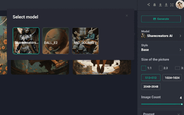 Use the powerful Sharecreators AI (quality equivalent to DALL_E2, Midjourney) to quickly generate the content you need, and you can also choose from a variety of styles (Trippy, Cartoon, 3D, etc.) at the same time, as well as detailed parameter settings to set up the generated content, to fully ensure that the AI-generated content meets your needs.